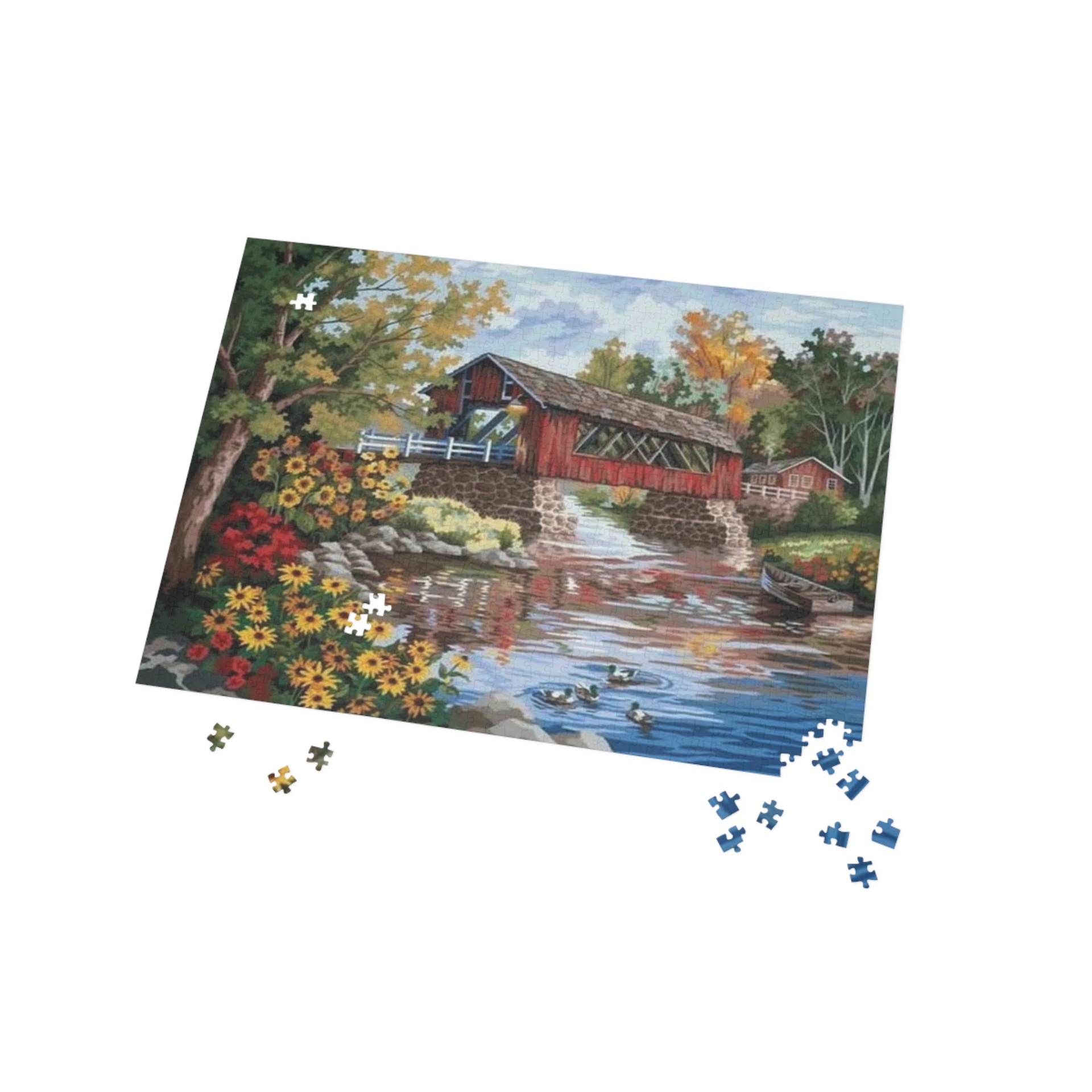 Piece by piece, this scenic puzzle brings a quiet riverside afternoon into your hands. Bright sunflowers frame a weathered covered bridge as ducks glide across a reflective stream. The colors are warm and true, the details crisp — each interlocking piece adds a little more calm until the full tableau is revealed. Lay it out on the table, cue soft music, and let the gentle rhythms of fitting pieces become a slow, soothing ritual. It’s the kind of project that turns a rainy afternoon into a place to linger, remember, and share with someone who loves relaxed, country charm.